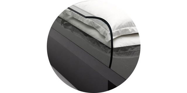 床屏采用现代感极强的夹胶双层安全玻璃弧形设计,并且在床屏两侧设有延伸板,内藏玻璃小抽屉,充满了艺术感。