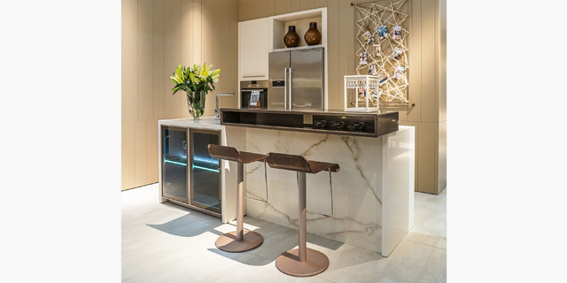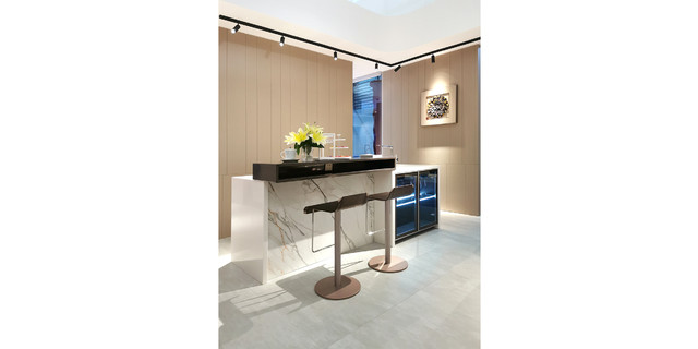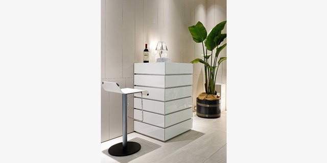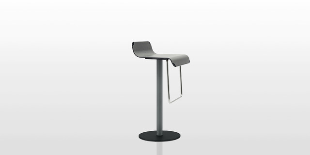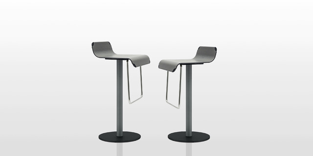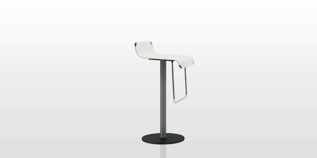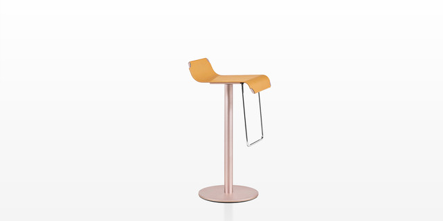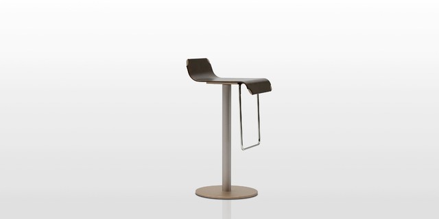 吧椅采用立柱转盘和抛光脚架设计,座垫处为优质树膏皮,纤巧时尚。