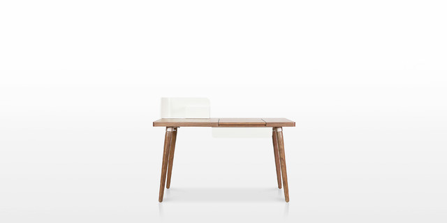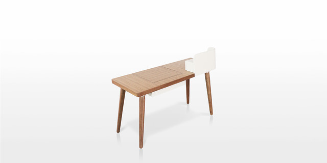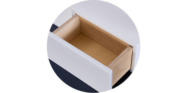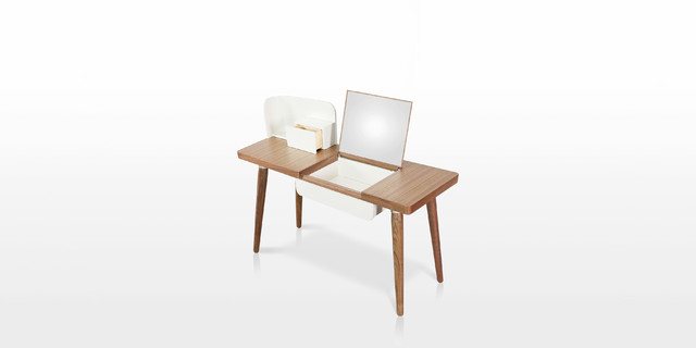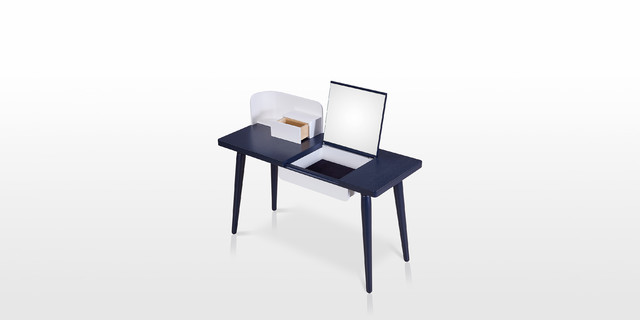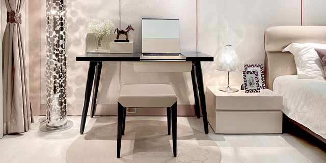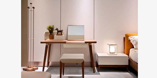 妆台采用胡桃木面或橡木面,台面掀揭式妆镜、阻尼铰链抽屉,小巧灵活。