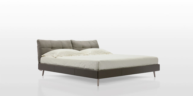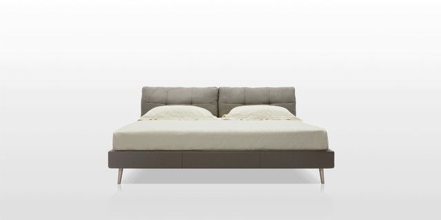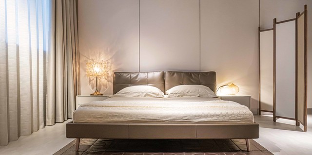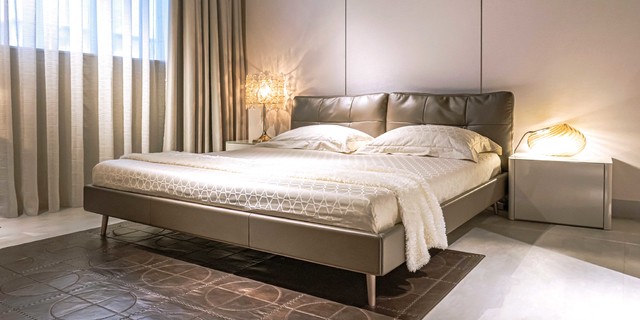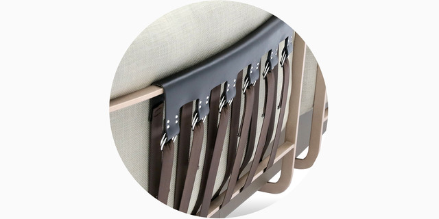 皮带扣式设计的床屏,结合玫瑰金色金属框架,显得时尚且赋有活力;超薄的床围采用真皮包裹,让整张床简洁而有温度。