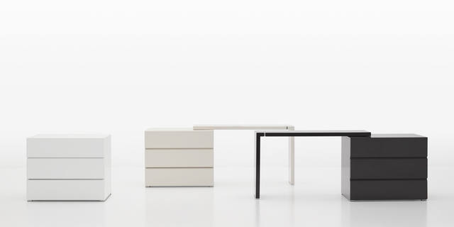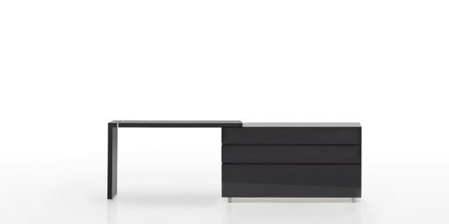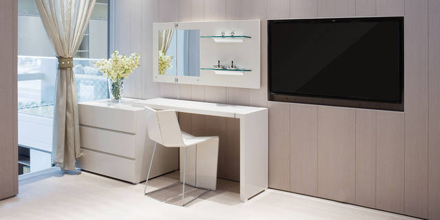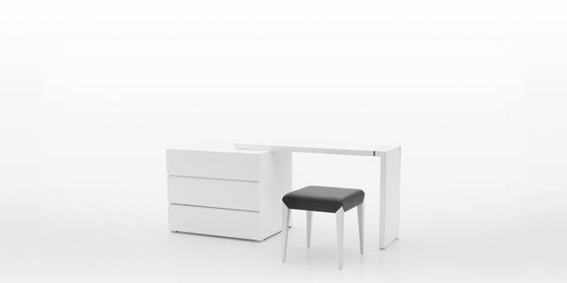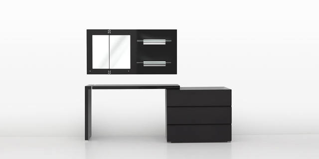 L型妆台搭配三桶柜,可根据家居空间进行灵活拉伸,自然原木色和现代亮面多样选择,简约而又时尚。